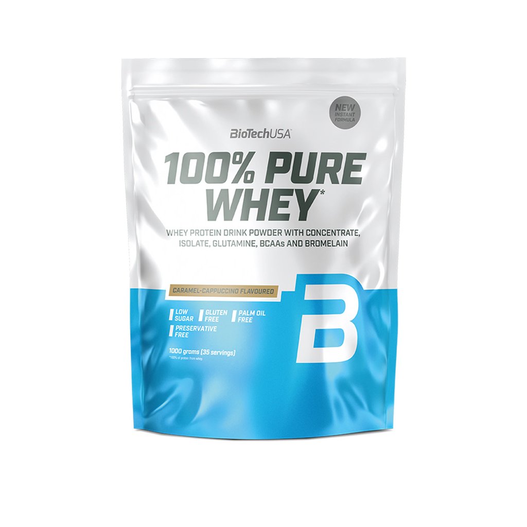 100% Pure Whey je vysoce kvalitní proteinový prášek s vysokou biologickou hodnotou. Je kombinací syrovátkového koncentrátu, syrovátkového izolátu a přidaných aminokyselin (L-glutamin, L-arginin a BCAA). Díky nízkému obsahu sacharidů a tuků je vhodný i v dietní fázi. Neobsahuje lepek ani palmový olej. K dostání je v pestré škále příchutí.Přednosti: