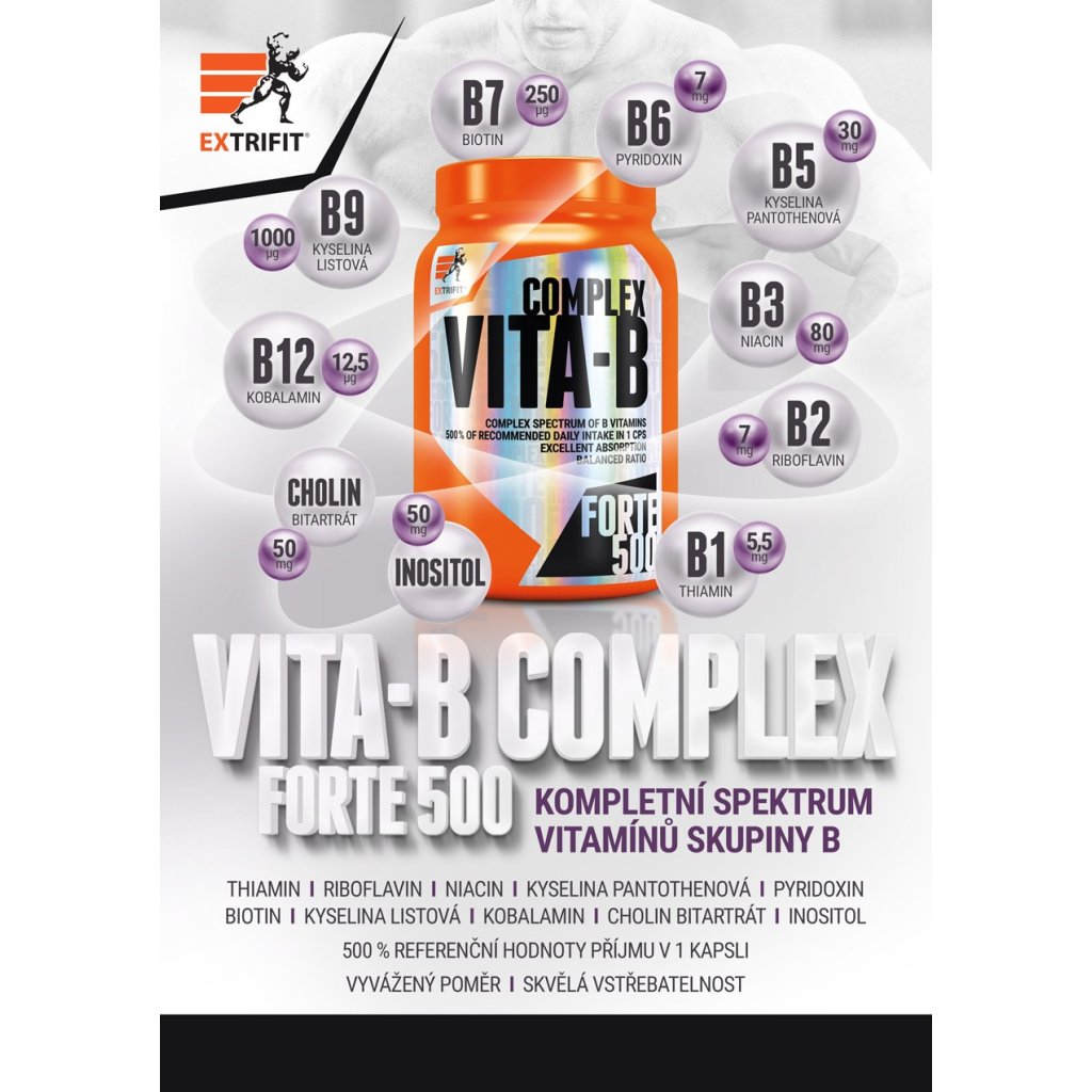 Produkt Vita-B Complex Forte 500 je doplněk stravy s obsahem kompletního spektra vitamínů skupiny B ve vyváženém poměru. Každá kapsle obsahuje 500 % referenční hodnoty příjmu (dříve označovaná také jako doporučená denní dávka). Kdy je vhodné doplnit vitamíny skupiny B ve formě doplňku stravy? V různých situacích, kdy se výrazně zvedá jejich spotřeba a/nebo když není možné zajistit stravou jejich dostatečný příjem. To se stává často právě u sportovců, kdy při intenzivní tělesné zátěži stoupá spotřeba vitamínů - a právě v kulturistice to bývá umocněno ještě rýsovací restriktivní dietou.