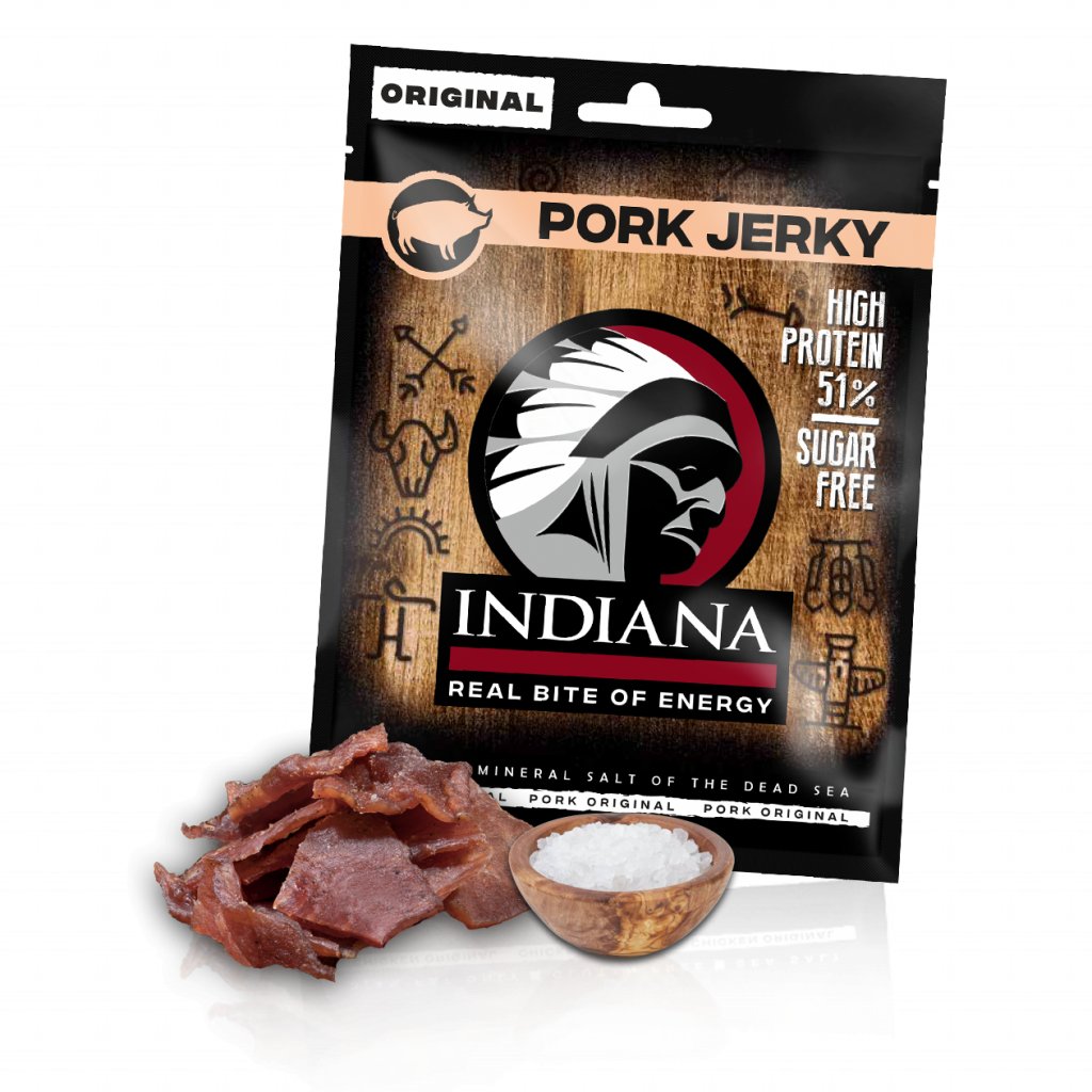 Jerky obecně označuje syrové maso, ze kterého je odstraněn tuk a následně je nakrájeno a vysušeno. Indiana Jerky jako takové pak náš náčelník vyrábí podle starých indiánských receptur. Indiana Jerky jsou tence nakrájené plátky libového masa, dále marinované, sušené a zauzené. Sušení probíhá několik hodin tak, aby si výchozí surovina zachovala jak přirozenou chuť masa, tak svou šťavnatost a pružnost. Pro sportovce nebo zdatného výletníka není zdravější, rychlejší a výživnější svačinky než sáček Indiana Jerky. Je to lehká, na dotek nemastná pochoutka, která obsahuje vysoké množství proteinů a jen minimum tuku. Pro výrobu byl zvolen závod, jež splňuje nejpřísnější hygienické normy.Přednosti:
